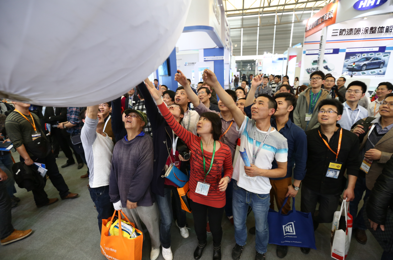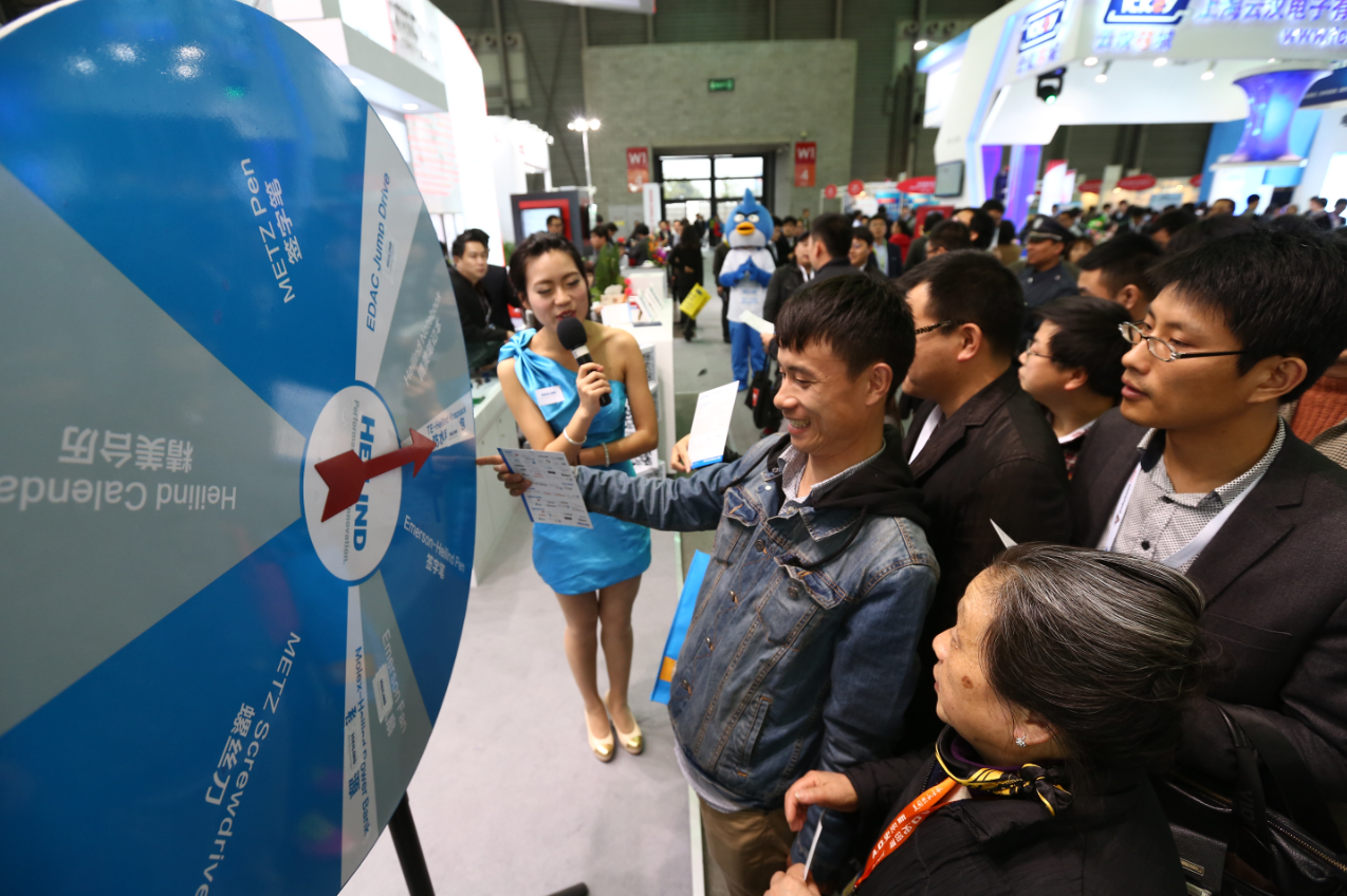 Lucky spinning wheel—visitors leave their namecards then move the spinning wheel to get varied souvenirs, such as jump drives, power bank, knapsack, screwdriver and pens etc.