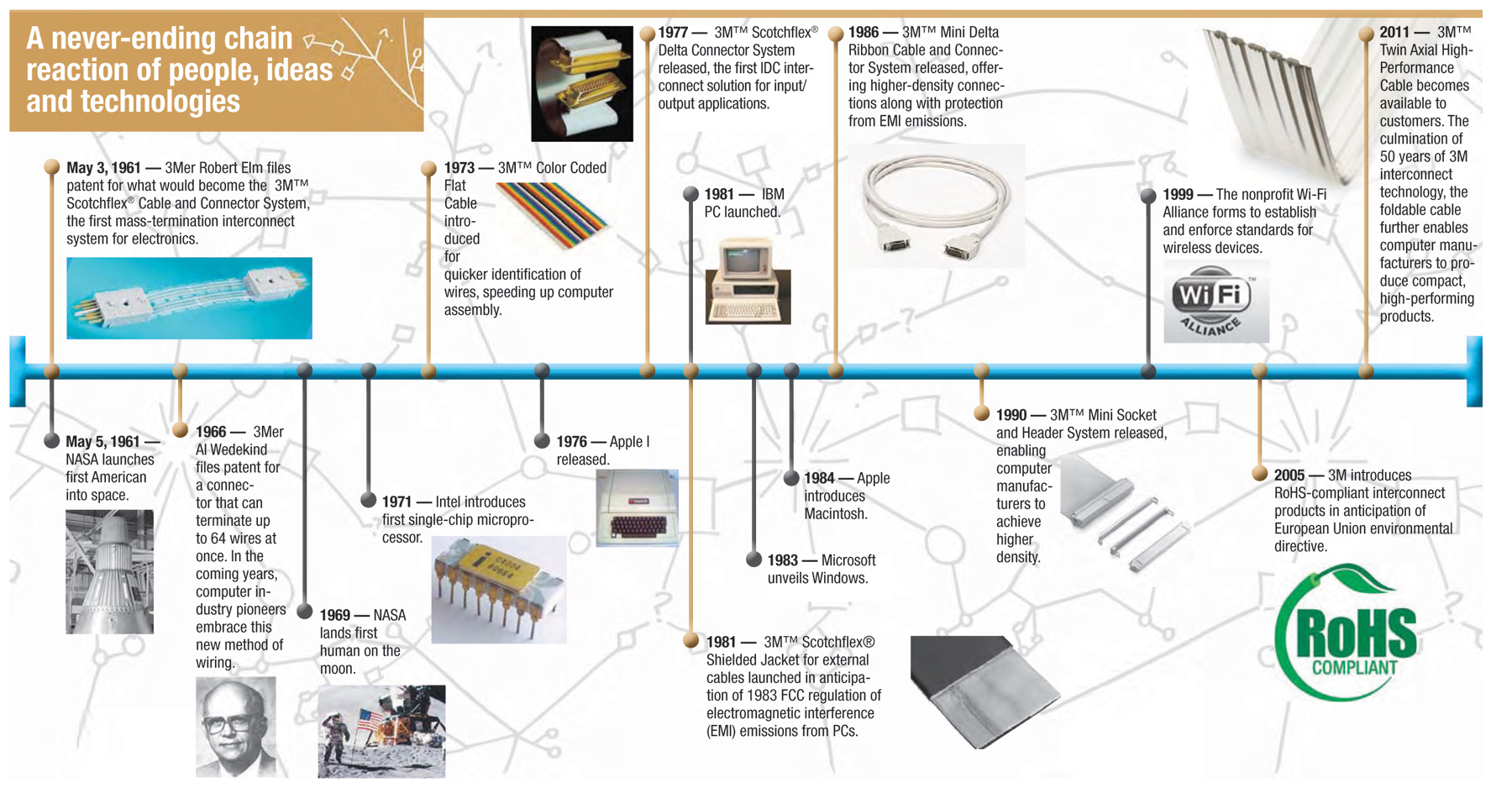 A Global, Diversified Technology Company. A Fortune 100 company, 3M brings its renowned commitment to design and innovation to its high-quality line of electronic connectors, adhesives, insulation products and static control products.