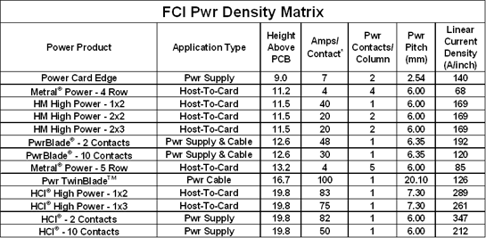 The power density matrix below groups FCI’s power offerings by several key attributes. The key attributes include product height above the PCB and linear current density (Amps/inch of board edge space) so power supply and system designers can choose the right product to meet their airflow and power density requirements.