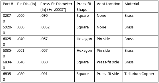 The pins featured here are often used in applications with more demanding mechanical/electrical requirements such as power supplies, power converters and any device subject to blind mating or rough handling. They are typically staked into a PCB at the press-fit end and either soldered or plugged in at the pin end. The smallest pin diameter in the group is .040" while the largest is at .080", typical sizes for DC-DC converters. These pins are suitable for high current applications, the limits of which depend on the temperature requirements and heat sinking abilities of the environment. The pin material is typically brass but for greater electrical conductivity and more efficient heat dissipation tellurium copper is also available.